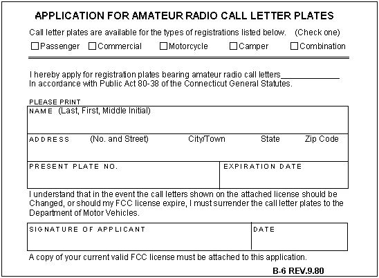Please print from link below, cut out, and mail the application form with a copy of your amateur radio license and a check for $25.00* payable to CT DMV. The name on the amateur license and the CT vehicle registration need to be the same.
